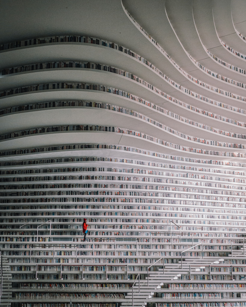 The Tianjin Binhai Library in China, photographed here by Tristan Zhou, is known for its futuristic design, eye-shaped atrium, and “book mountain,” which doubles as seating and stairs.