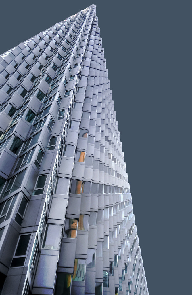 With that being said, you can take a great skyscraper photograph from anywhere. If you’re working from ground level, consider mixing it up with abstract “look-up” style images, combining the lines of the building with the sky above. Peter Stewart, for example, is well known for his photographs from courtyards of housing blocks created from this perspective—looking straight up.